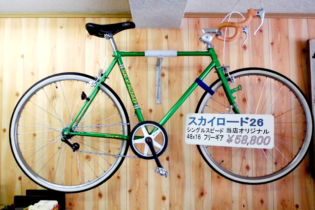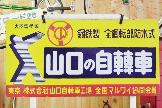この山口自転車の看板は倉庫で発見したもので、父の時代の主力商品でした。軒先に下げるタイプと思われます。